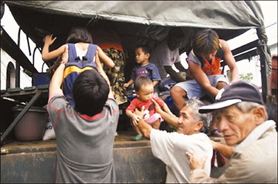 平板貨車、警方特許客貨車,甚至垃圾車均被征用接載災(zāi)民離開(見圖)。總統(tǒng)阿羅約夫人縮短新加坡訪問回國。