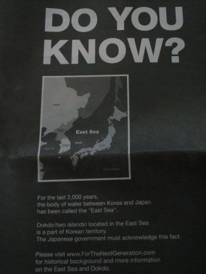 這一廣告刊登于《紐約時報(bào)》7月9日A15版,標(biāo)題為“您知道嗎?”(Do you know?)。廣告上刊登了朝鮮半島周邊地圖以及“在過去的2000年里,韓國和日本之間的海一直被稱為東海,位于東海的獨(dú)島是韓國的領(lǐng)土。日本政府必須承認(rèn)這個事實(shí)”的內(nèi)容。廣告中還建議“韓國和日本應(yīng)該讓下一代了解歷史的真相,同時,兩國從現(xiàn)在開始就應(yīng)為東北亞的和平與繁榮共同努力”,并留下了韓國歷史宣傳網(wǎng)站“為了下一代()”的網(wǎng)址,以便讓《紐約時報(bào)》的讀者可以看到更詳細(xì)的內(nèi)容。