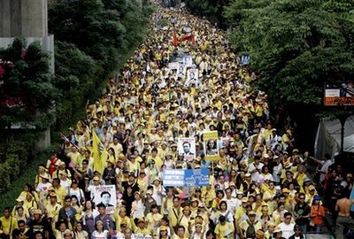 中新網10月31日電 據“中央社”報道,泰國擁政府派誓言10月31日展開集會,加上反政府的人民民主聯盟群眾30日凌晨遭手榴彈攻擊,社會對立的緊張氣氛高漲。分析認為,緊張氣氛恐怕在11月1日前總理他信越洋聯機活動當天達高峰。