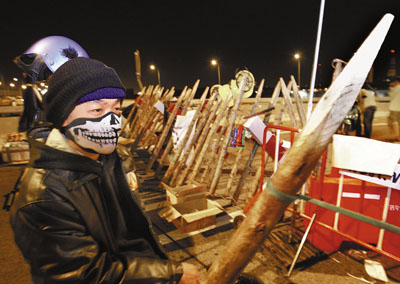民盟示威者全副武裝,在機場外要道把關。