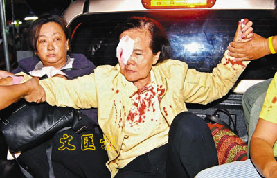 被炸傷的一名黃衣示威者眼部血流不止,在其它人協助下撤離現場