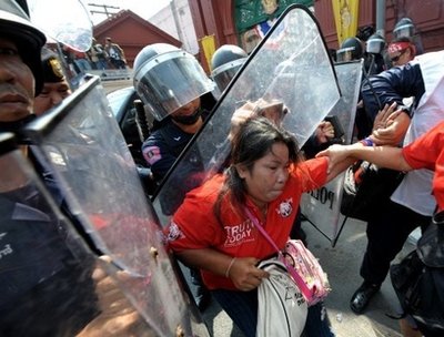 示威者投擲鐵欄泄憤,有人用磚砸爛議員的汽車,防暴警察組成人鏈,防止示威者沖擊。一名記者鼻梁被石擊中,一名防暴警察頭部也受傷,警方一度要增援。示威者其后散去。據報,他信的支持者亦在東北部多個省分示威,抗議阿披實當選。