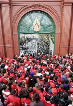 泰國(guó)支持他信的“紅衫軍”“反獨(dú)裁民主聯(lián)合陣線(xiàn)”(UDD)日前在國(guó)會(huì)大廈外進(jìn)行示威時(shí),誤將國(guó)王普密蓬和王后詩(shī)麗吉的畫(huà)像放在一幅帶有攻擊性標(biāo)語(yǔ)的邊上,此舉倍受指責(zé),反獨(dú)裁民主聯(lián)合陣線(xiàn)的領(lǐng)導(dǎo)人將面臨冒犯君主罪的起訴。