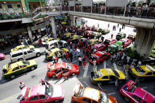 中新網(wǎng)4月10日電 據(jù)泰國(guó)《民族報(bào)》10日?qǐng)?bào)道,曼谷勝利紀(jì)念碑附近及周圍的數(shù)條街道被數(shù)百反政府的出租車司機(jī)、摩托車司機(jī)和約5000示威者擁堵,曼谷市中心的交通已經(jīng)癱瘓。
