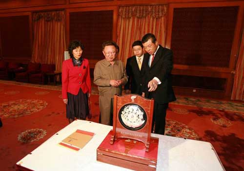 劉大使向金正日總書記贈(zèng)送北京奧運(yùn)紀(jì)念銀盤(圖片來源:外交部網(wǎng)站)