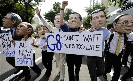 中新網(wǎng)7月6日電 八國集團(tuán)首腦峰會7日起一連3日在日本北海道洞爺湖舉行。由國內(nèi)外活躍分子、公民組織成員、非政府組織成員組成的數(shù)千示威者5日在札幌游行,高叫“我們抗議富國召開峰會”。國際樂施會成員沿用慣常的諷刺手法,裝扮成日本首相福田康夫、美國總統(tǒng)布什等八國領(lǐng)導(dǎo)人,穿著和服合唱卡拉OK版的Abba樂隊名曲《Money, Money, Money》。
