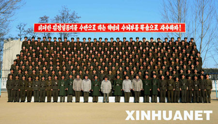 資料圖片:在這張朝鮮中央通訊社12月19日公布的照片中,朝鮮最高領導人金正日與人民軍955部隊指戰員合影。據朝鮮中央通訊社19日報道,金正日于近日視察了朝鮮人民軍955部隊司令部。新華社/朝中社
