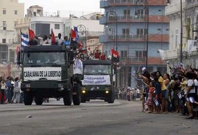 在厄瓜多總統(tǒng)柯雷亞的陪同下,古巴領(lǐng)導(dǎo)人、卡斯特羅之弟勞爾-卡斯特羅參加了在一處前軍事基地舉行的慶祝典禮。這處軍營是卡斯特羅在1959年1月8日抵達(dá)哈瓦那后,向成千上萬歡欣鼓舞的古巴人發(fā)表演說的地點(diǎn)。