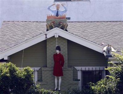 中新網10月29日電 據香港《文匯報》二十九日報道,美國加州西好萊塢巿有一戶人,在家門口將共和黨副總統候選人佩林的假人吊頸,并在煙囪頂“火燒”麥凱恩的假人,作為萬圣節裝飾,巿長隨即譴責。