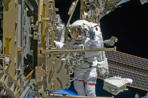 美國太空人甘保二十日?qǐng)?zhí)行任務(wù)時(shí),停下來向鏡頭揮手。(美國宇航局圖)