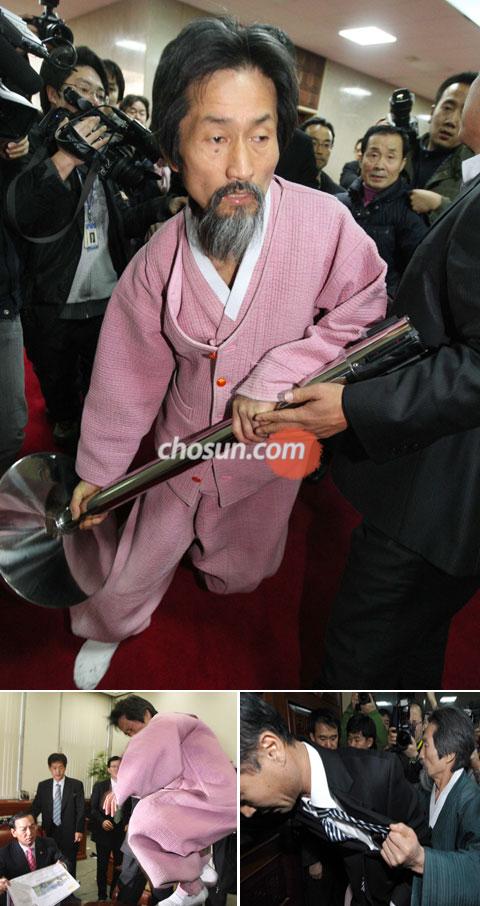中新網(wǎng)1月6日電 據(jù)韓國(guó)《朝鮮日?qǐng)?bào)》報(bào)道,5日上午,韓國(guó)首爾汝矣島的國(guó)會(huì)大廈變成了一片混亂之地。身穿韓服的民主勞動(dòng)黨代表姜基甲一直不停地踢國(guó)會(huì)議長(zhǎng)辦公室門口。姜基甲大聲大叫:“國(guó)會(huì)議長(zhǎng)在哪里?趕快出來!”姜基甲手里拿著長(zhǎng)圓型鐵棒試圖進(jìn)入議長(zhǎng)辦公室,但被國(guó)會(huì)警衛(wèi)人員阻止。之前,姜基甲進(jìn)入國(guó)會(huì)秘書長(zhǎng)辦公室,在國(guó)會(huì)秘書長(zhǎng)樸啟東眼前,用拳頭敲打圓形桌子,要顛翻桌子。他甚至蹦到桌子上,氣得直跺腳。