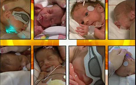 據(jù)東森新聞報道,出生至今兩個星期,八胞胎的母親娜達雅蘇利曼(Nadya Suleman)通過美國國家廣播公司的鏡頭,把孩子們一一介紹給大眾認識。擔心自己的手太冰冷嚇到孩子,娜達雅蘇利曼還刻意把雙手搓了搓,才小心翼翼地輕輕撫摸孩子。這八胞胎都非常瘦小,身高可能都只到他們母親雙手手掌相連的長度而已。