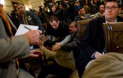 不過(guò),塔拉巴尼的話似乎并不能代表全體伊拉克人民的真實(shí)感受。在與馬利基的聯(lián)合發(fā)布會(huì)上,布什講話時(shí),一名伊拉克記者將兩只鞋朝布什扔了過(guò)去,并高聲辱罵:“這是伊拉克人民給你的告別之吻!”好在布什身手敏捷,彎腰躲過(guò)了襲擊。隨后,馬利基英雄救“美”,用身體擋住了這位美國(guó)客人,而那個(gè)丟鞋的男子也被保安制服。