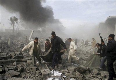 以色列發動的空襲行動摧毀了數個哈馬斯警察的院落,死傷者倒在地上。這是巴勒斯坦人二十多年來所遭遇的最血腥的一天。