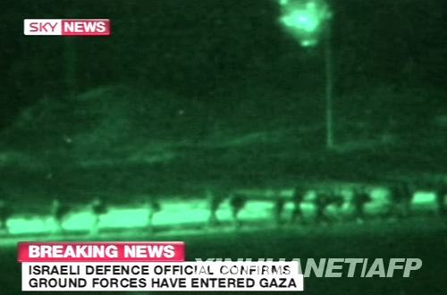 1月3日,以色列軍人行進在加沙地帶北部的拜特拉希亞鎮附近(電視截屏畫面)。來自以色列和巴勒斯坦方面的消息證實,以軍當地時間1月3日晚間8時30分左右展開了對加沙地帶的地面攻勢。新華社/法新