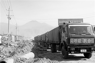 記者看到,這兩支車隊中既有拉運物資的軍用汽車,也有地方運輸公司的大噸位加長卡車,還有載有建筑工人的中鐵建設集團的專用運輸車等,遠遠看去,車隊就像一條長龍,一眼望不到尾。建筑大軍浩浩蕩蕩開進玉樹災區(qū)的場景令記者既震撼,又振奮。
