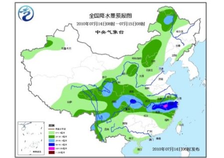 14日08時至15日08時,新疆西部的部分地區、西藏中東部、西北地區中東部、內蒙古西部偏東地區和中東部、黑龍江西部、吉林東部、遼寧西南部和東部、華北大部、黃淮西部、江淮西部、江漢、江南中東部和西北部、西南地區大部、廣東西南部和東北部、廣西西部和南部、海南、臺灣北部等地有小到中雨或陣雨,其中,湖南北部、湖北西部和東南部、安徽南部、江西北部、浙江大部有大到暴雨,局部地區有大暴雨;四川東北部、重慶北部、陜西南部、云南西北部、青海東部、甘肅西南部、川西高原東北部和南部、內蒙古東北部等地的部分地區有大雨、局地暴雨;上述局部地區并伴有短時雷雨大風等強對流天氣。新疆西部、甘肅河西地區東部、內蒙古中部等地有4~6級風。受強熱帶風暴“康森”影響,南海中北部偏東海域、臺灣以南海域有7~9級大風;“康森”中心經過的附近海面風力可達10~12級。黃海南部有5~6級、陣風7級的東北風;東海北部有6~7級、陣風8級的旋轉風。