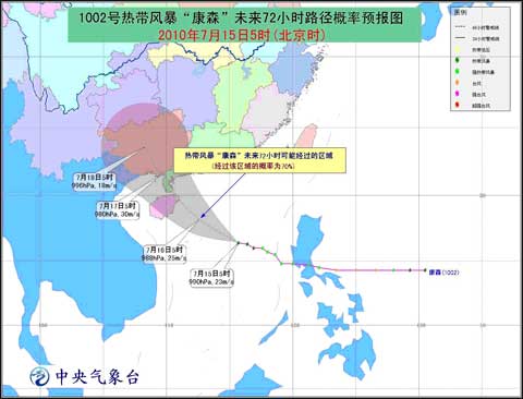 預計,“康森”將以每小時20公里左右的速度繼續向西偏北方向移動,強度將有所加強,并逐漸向海南陵水到廣東陽江一帶沿海靠近,將于16日下午到17日凌晨在這一帶沿海登陸。