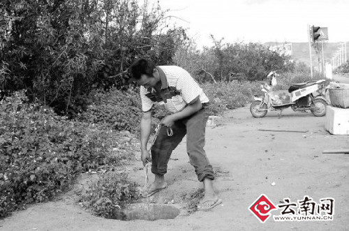 昨日下午,蒙自縣文瀾鎮高家寨的戴橋紅,正拎著一只水桶在紅河大道上找水,他找水的地方是紅河大道上的排污管道。在紅河大道的非機動車道上,許多窨井蓋都不見了,紅河大道兩旁的果農們,每天都會開著車或者騎著摩托來找水。