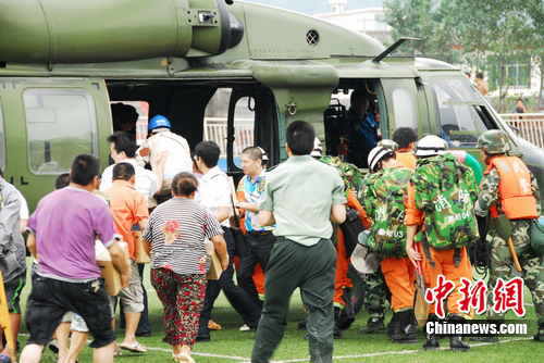 中午12時05分,空軍陸航團派出兩架直升飛機前來支援,深入災(zāi)區(qū)探測道路情況和人員被困情況。從下午1點14時45分至下午4點,消防支隊共派出30人,由參謀長徐昌榮帶隊分六批次搭乘空軍陸航團飛機帶上破拆工具、生命探測儀、照明工具、水上救援工具、安全救生繩索等已安全到達清平災(zāi)區(qū)。30名消防官兵到達災(zāi)區(qū)后,立即設(shè)立了消防部隊搶險救援指揮部,指揮一線官兵積極投入救援工作,爭分奪秒營救被困群眾。