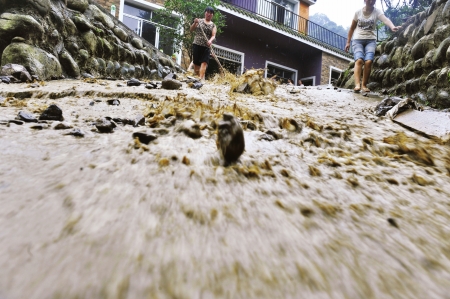 13日凌晨零點20分左右,都江堰上空突降暴雨,局部地區(qū)達到142毫米。強降雨造成都江堰城區(qū)和部分山區(qū)出現(xiàn)險情,城區(qū)內(nèi)多處民房和街道被淹。部分板房安置區(qū)因提前備好抽水設備,積水短時間內(nèi)即被排出。都江堰水務局防汛辦主任張普龍說,這是近10年來,都江堰短時最大強降雨。