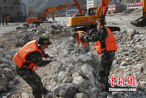 自8月8日以來,武警水電部隊500余名官兵和130余臺大型機械設備日夜連續奮戰在舟曲白龍江堰塞體搶險一線,他們采取“挖、裝、運”相結合、調運長臂反鏟深掏、人工安裝鐵絲籠固定護坡等作業方式,疏通河道,加快白龍江存水泄流速度,盡快消除洪水隱患。