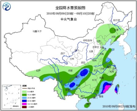 8日20時至9日20時,西藏中東部、青海南部、甘肅南部、寧夏南部、陜西、內蒙古中部、華北大部、黃淮、江淮、江漢、江南大部、華南以及西南地區(qū)等地有小到中雨或陣雨,其中,四川盆地、川西高原中部、甘肅東南部、陜西南部、重慶西部和北部、福建東南部沿海、廣東中東部沿海、臺灣中南部等地有大雨或暴雨,四川盆地東北部局地有大暴雨;內蒙古中部、山東半島東部、蘇皖中部、江西西部、廣西東南部、海南南部等地的部分地區(qū)有大雨;上述局部地區(qū)并伴有短時雷雨大風或冰雹等強對流天氣。新疆北部、甘肅西部、內蒙古中西部和東南部等地有4~6級風。受10號熱帶風暴影響,臺灣海峽、臺灣以東洋面和以南海域、南海東北部有7~9級大風,風暴中心經過的附近海域風力有10級,陣風11~12級;東海南部有5~7級東南風。黃海中北部有5~6級旋轉風;南海中部有5~6級西南風。