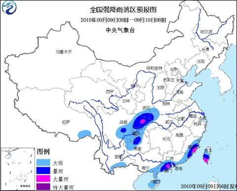 9月9日08時到10日08時,四川盆地、川西高原東南部、陜西南部、重慶大部、貴州中北部、湖北西北部、福建東部、廣東東部和南部、臺灣大部、廣西南部、海南等地有大雨或暴雨,其中,四川盆地東北部、福建東南部沿海、臺灣南部、廣東西南部等地的局部地區(qū)有大暴雨。另外,西藏東南部、云南南部等地的部分地區(qū)有大雨。上述局部地區(qū)并伴有短時雷雨大風(fēng)或冰雹等強(qiáng)對流天氣。