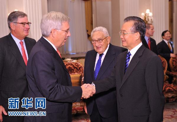 當地時間9月22日上午,在紐約華爾道夫飯店一間寬敞的會議室里,溫家寶總理望著坐在身旁的基辛格,以40多年來中美關系的發展入題,與美國企業、金融和學術界一些著名人士展開座談和交流。