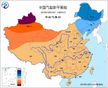 中新網10月11日電 據中央氣象臺預報,未來10天,影響中國的冷空氣較為頻繁,北方地區冷暖變化較大,南方地區氣溫變化較平穩。新疆、甘肅西部、內蒙古西部地區平均氣溫比常年同期偏高1-2℃,內蒙古東北部、東北地區中北部比常年同期偏低1-2℃,中國其余大部地區氣溫接近常年同期。