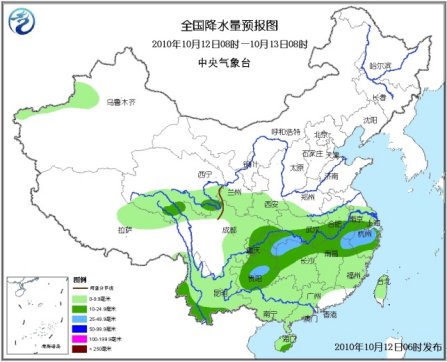 中新網10月12日電 據中央氣象臺預報,未來三天,新疆西部山區、西藏東部、青海東部和南部、內蒙古東北部、黑龍江西北部、甘肅南部、川西高原西北部等地有小到中雨(雪)或雨夾雪,西藏東北部、青海東南部局地有大雪;陜西南部、黃淮南部、江淮、江漢、江南、華南、西南等地有小到中雨或陣雨,其中,四川南部、重慶中北部、貴州中部、云南北部、湖南北部、湖北南部、江西北部、安徽南部、浙江中部等地有大雨,上述地區局部并伴有短時雷雨大風等強對流天氣。
