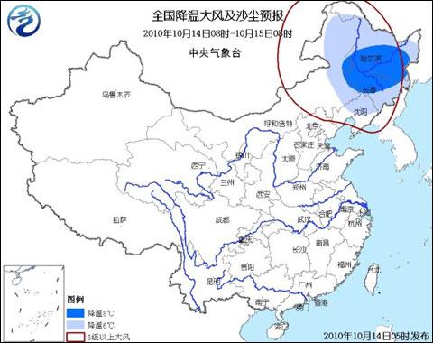 10月14日08時-10月15日08時,全國降溫大風及沙塵預報圖