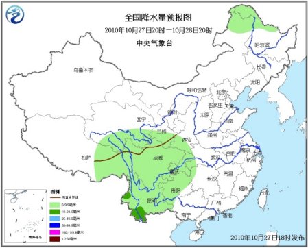 27日20時至28日20時,西藏東部、青海南部、甘肅南部、川西高原北部、內蒙古東北部、黑龍江西北部等地的部分地區有小雨(雪)或雨夾雪;陜西南部、湖北西南部、西南地區大部等地有小到中雨或陣雨。內蒙古東北部、東北北部、華南沿海等地有4~6級風。東海、臺灣海峽、臺灣以東洋面將有9~10級風,陣風可達11~12級;南海將有7~8級、陣風9~10級風。