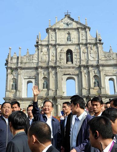 14日,溫家寶在澳門特別行政區行政長官崔世安的陪同下,先后參觀澳門大炮臺、澳門博物館、大三巴牌坊,考察了澳門生產力暨科技轉移中心、澳門工聯北區綜合服務中心、仁伯爵綜合醫院、澳門大學等機構,看望澳門廣大市民,和大家真情互動,深切了解澳門歷史和經濟、社會發展情況。他還走訪市民家庭,了解澳門普通居民的生活現狀。
