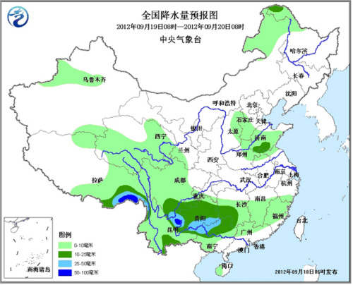 19日08時至20日08時,新疆沿天山地區、青藏高原中東部、西南地區、華南西部、江南西部、華北南部、黃淮大部、內蒙古東北部等地有小到中雨或陣雨,其中,西藏東南部、云南東北部、貴州東南部、廣西西北部的部分地區有大雨,局地暴雨。東海南部海域、臺灣海峽、臺灣以東洋面將有5~6級、陣風7級的東北風。