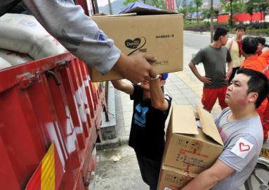 4月25日,蘆山縣城志愿者包辦了許多發(fā)放接送物資的體力活。