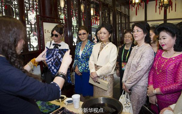 彭麗媛和貴賓們在豫園靜觀的展臺前駐足停留,聽取介紹。彭麗媛不時拿起面塑、扎染布等傳統手工藝品給貴賓們欣賞。“農民畫用的是什么顏料?”“木版水印和版畫有什么區別?”“扎染布會褪色嗎?”……大家紛紛提問,同非物質文化遺產傳承人親切交流。