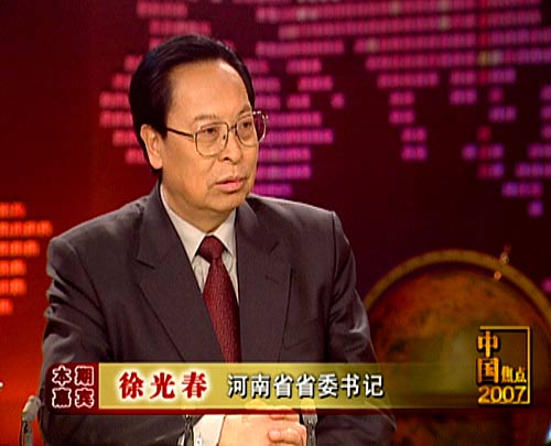 好,接下來我們繼續來關注新農村建設的話題。今天在演播室我們非常容幸地邀請到中共河南省委書記徐光春先生。您好,徐書記。
