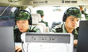 濟南軍區導調組在部隊摩托化開進中對參演部隊實施電子監控、干擾。