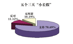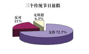 據統計,昨天上午方案公布至22時,五大網站共有約45萬名網民參與了調查。投票結果顯示,近九成網民支持國家法定節假日總天數由10天增加到11天,七成多的網民支持增加清明、端午、中秋三個傳統節日為國家法定節假日,八成網民支持保留十一國慶節和春節兩個黃金周,八成多的網民支持將春節放假時間提前到除夕,近八成網民支持將元旦、五一及三個新增法定假日與前后周末調整成連續三天的“小長假”,九成多的網民支持全面推行職工帶薪休假制度。