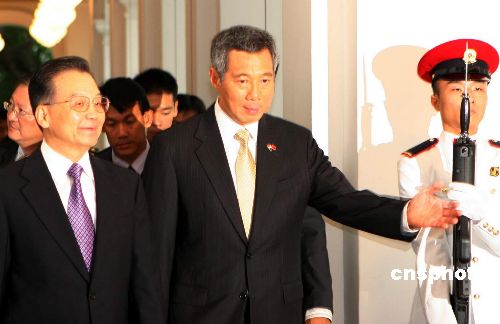 中新社新加坡十一月十八日電 (記者 周群)新加坡總理李顯龍今天下午在總統府前廣場舉行儀式,歡迎到訪的中國國務院總理溫家寶。