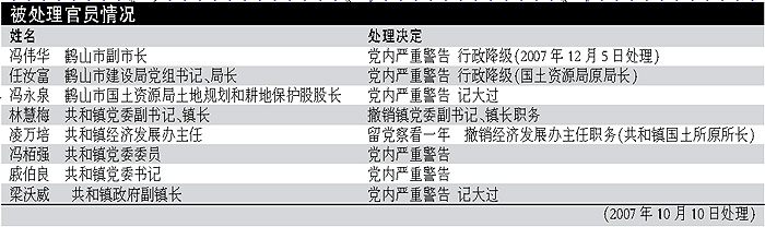據(jù)監(jiān)察部、國(guó)土資源部12月11日發(fā)布的通報(bào),鶴山市通過偽造虛假材料和化整為零的辦法,擅自調(diào)整規(guī)劃、違法補(bǔ)辦手續(xù),違規(guī)批準(zhǔn)該市共和鎮(zhèn)3626.8畝土地用于工業(yè)開發(fā),受到監(jiān)察部、國(guó)土資源部專案調(diào)查組的嚴(yán)厲批評(píng)。記者采訪了解到,江門市紀(jì)委、監(jiān)察局已經(jīng)對(duì)鶴山市副市長(zhǎng)馮偉華給予嚴(yán)重黨內(nèi)警告、行政降級(jí)處分,給予國(guó)土局原局長(zhǎng)任汝富黨內(nèi)嚴(yán)重警告、行政降級(jí)處分。