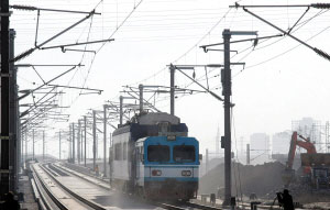 按照計劃,京津城際接觸網今天全線受電。在冷滑試車后,京津城際鐵路將啟動熱滑試車,同時進行全線設備系統綜合調試,預計春節后,時速300公里的新車將上線調試,五六月份開始空載試運行,保障8月份順利開通運營。(記者 王月 段毅剛攝影)