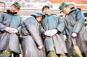 換防下來的部隊士兵正靠在廣州火車站的一角休息。為了維持火車站的秩序,部隊戰士和火車站員工等連續奮戰了好幾天。