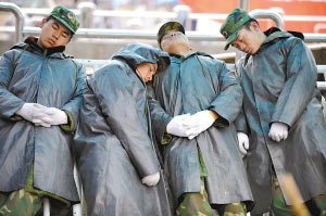“真是太不好意思了!”下午4點25分,在該部二連會議室,記者見到了4名戰士的“廬山真面目”。面對記者的追問,他們對“站著睡覺”一事表現得十分尷尬。“作為班長骨干,我們更愿意將自己威武剛毅的形象展現給人民群眾,可是由于已經連續奮戰了39個小時,確實累得沒有辦法。從到火車站執行任務開始,背包都沒有打開過。”黃金華說。