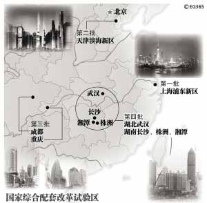 2007年6月,重慶和成都聯合獲準成立“成渝全國統籌城鄉綜合配套改革試驗區”;12月,位于中部腹地的武漢城市圈和長沙、株洲、湘潭城市群成為“全國資源節約型和環境友好型社會建設綜合配套改革試驗區”。