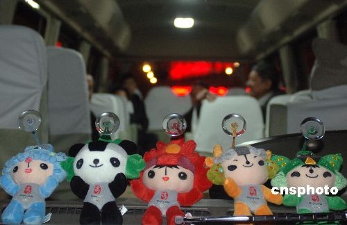 迎接的車輛上放置的奧運(yùn)福娃。中新社發(fā) 廖攀 攝