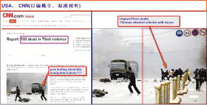 其一是“以偏概全,混淆視聽(tīng)”。3月17日,CNN和法新社在各自網(wǎng)站上使用了同一張圖片,圖中兩輛綠色卡車一前一后正向兩名平民駛來(lái)——事實(shí)上,如果完整展示圖片的話,可以看到當(dāng)時(shí)軍車旁有約10名暴徒在向軍車投擲石塊,雖然CNN網(wǎng)站的圖片說(shuō)明寫(xiě)的是“藏人向軍車投擲石塊”,但圖中卻看不見(jiàn)這一已被裁去的場(chǎng)景。