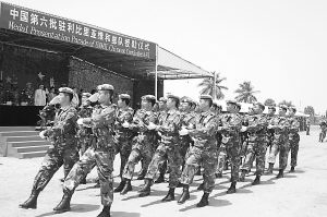 今天(26日)上午10時(shí)整,在地中海畔中國(guó)工兵營(yíng)舉行的授勛儀式上,聯(lián)合國(guó)授予了中國(guó)第三批赴黎巴嫩維和部隊(duì)343名官兵“和平勛章”。