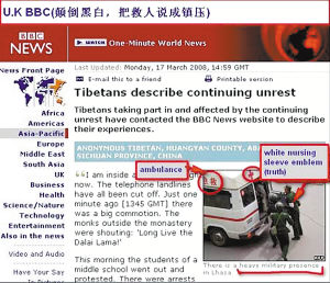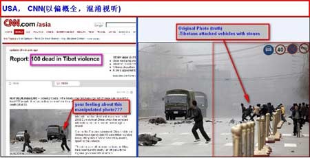 因此,“事件”初期,國際媒體上充耳塞目的是經(jīng)過“精心”剪裁的照片和聳人聽聞的關(guān)于拉薩的報道。令人不解的是,在事發(fā)三小時內(nèi),中新社首發(fā)了兩張拉薩古城濃煙滾滾、民眾倉皇奔逃的即時照片,除了華人世界媒體廣泛采用外,可能只能躺在好多西方媒體圖片庫里呻吟了,要知道這是中國媒體最先發(fā)出關(guān)于拉薩事件中的第一聲“呻吟”啊,可能是人家剪裁起來不好下手吧!